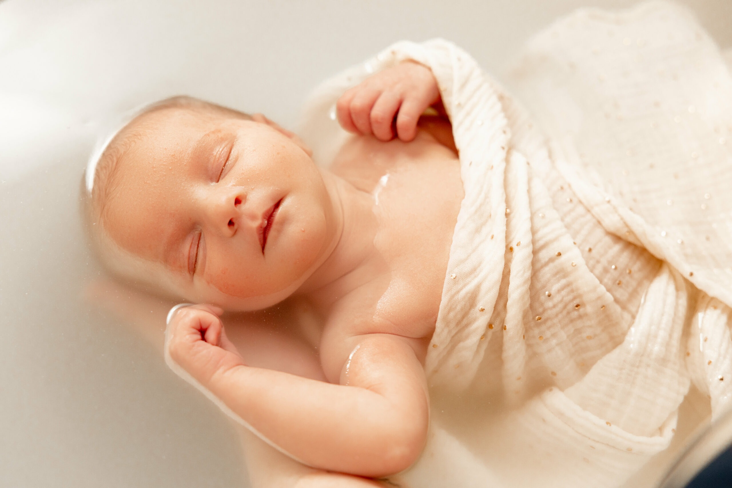 Bébé est emmailloté dans un lange afin de retrouver des limites autour de son corps, comme les parois utérines le faisaient. Ses oreilles sont plongées sous l’eau pour lui permettre de retrouver des sons familiers (car oui, rappelons qu’il a vécu 9 mois en milieu aquatique, et que les bruissements de l’eau lui sont connus !).